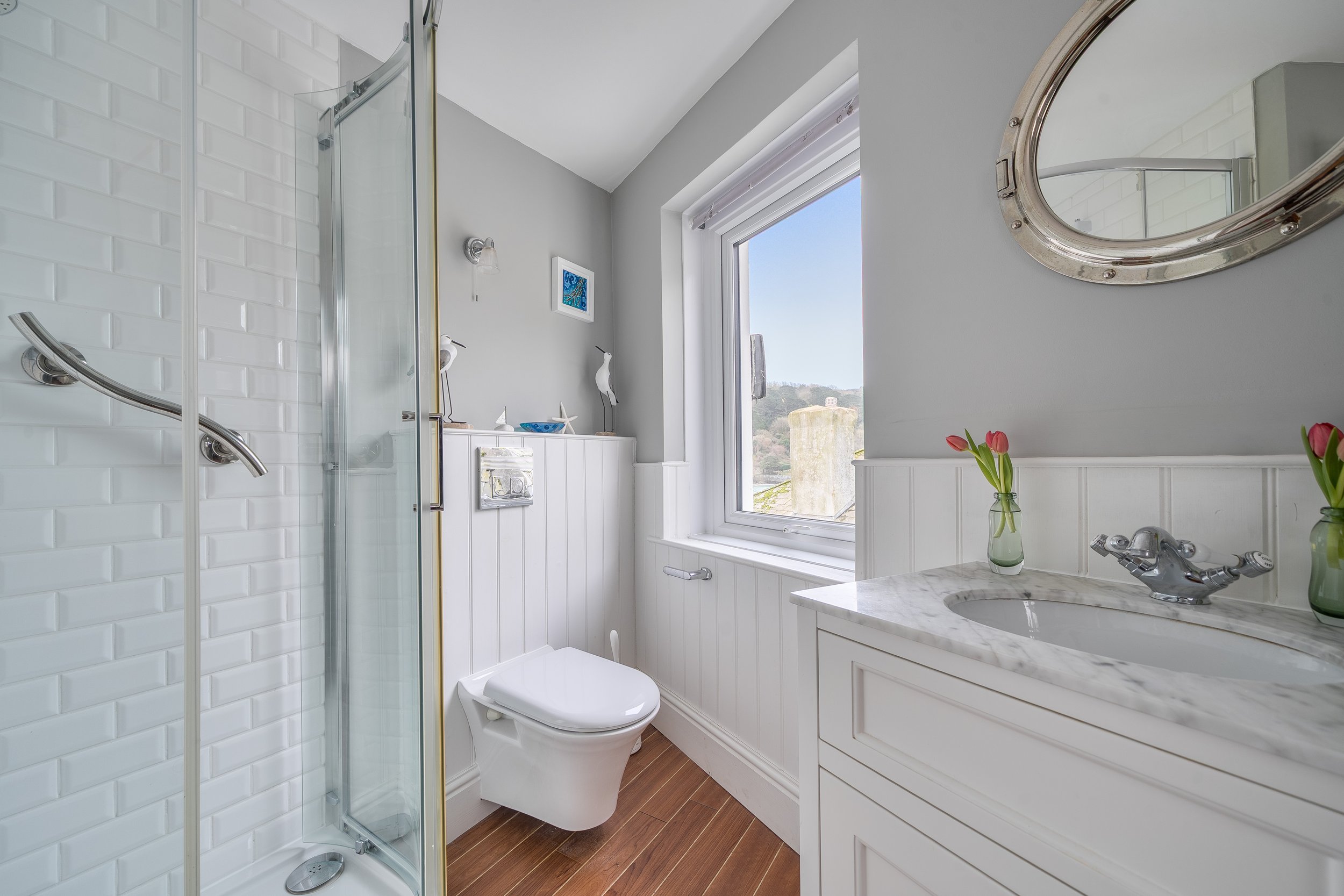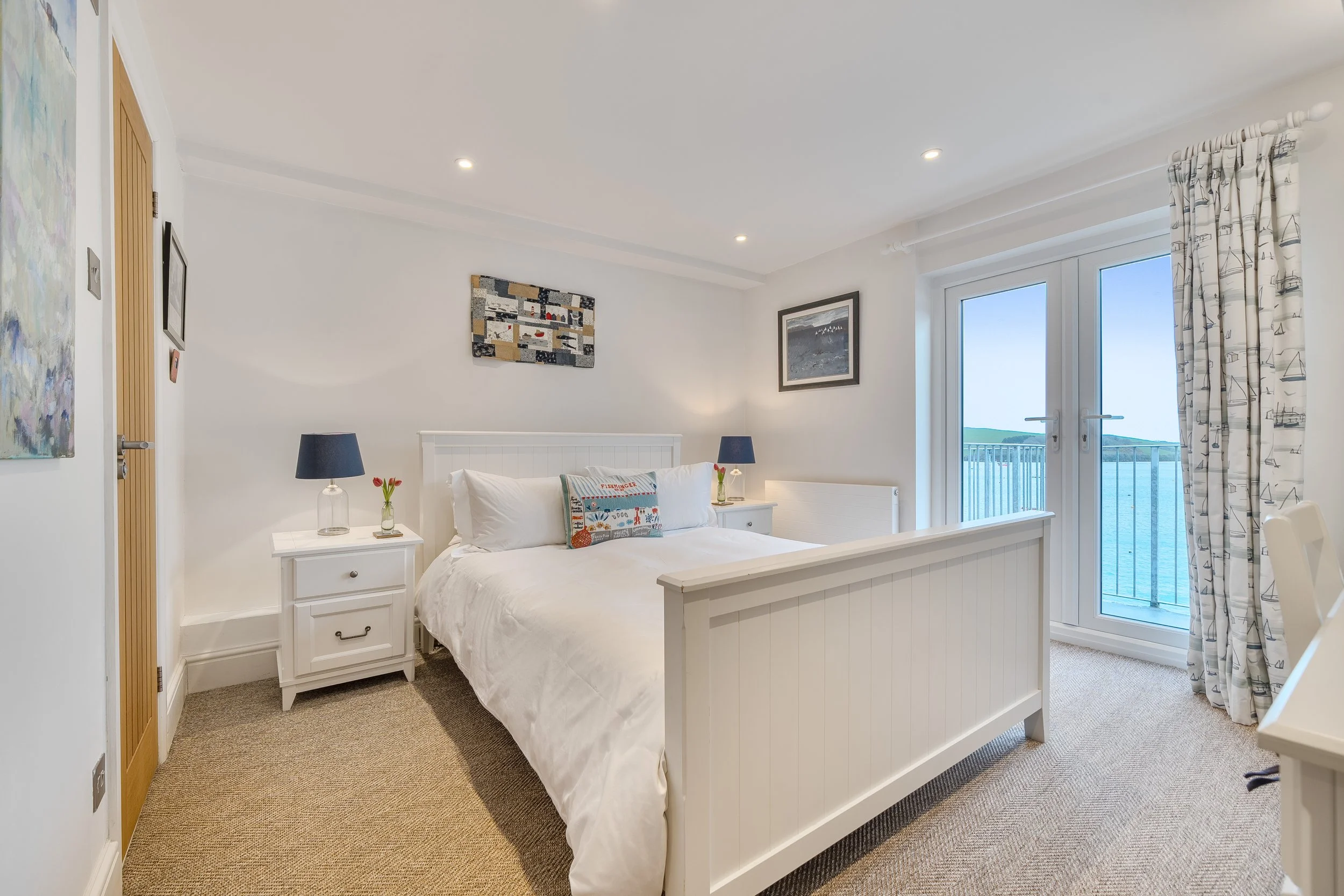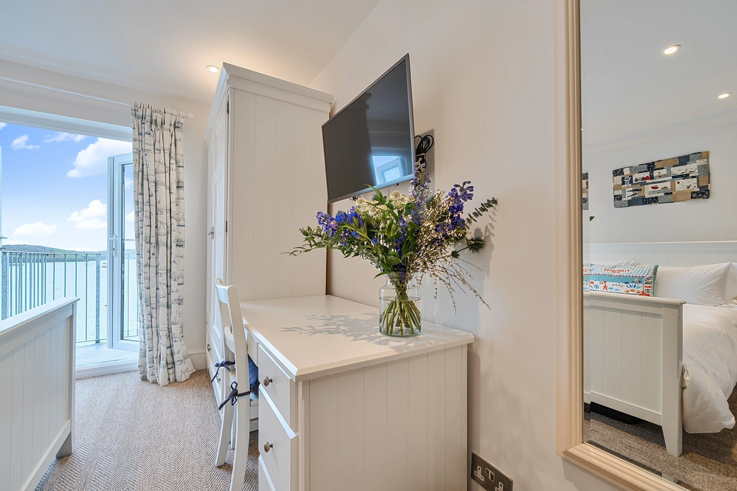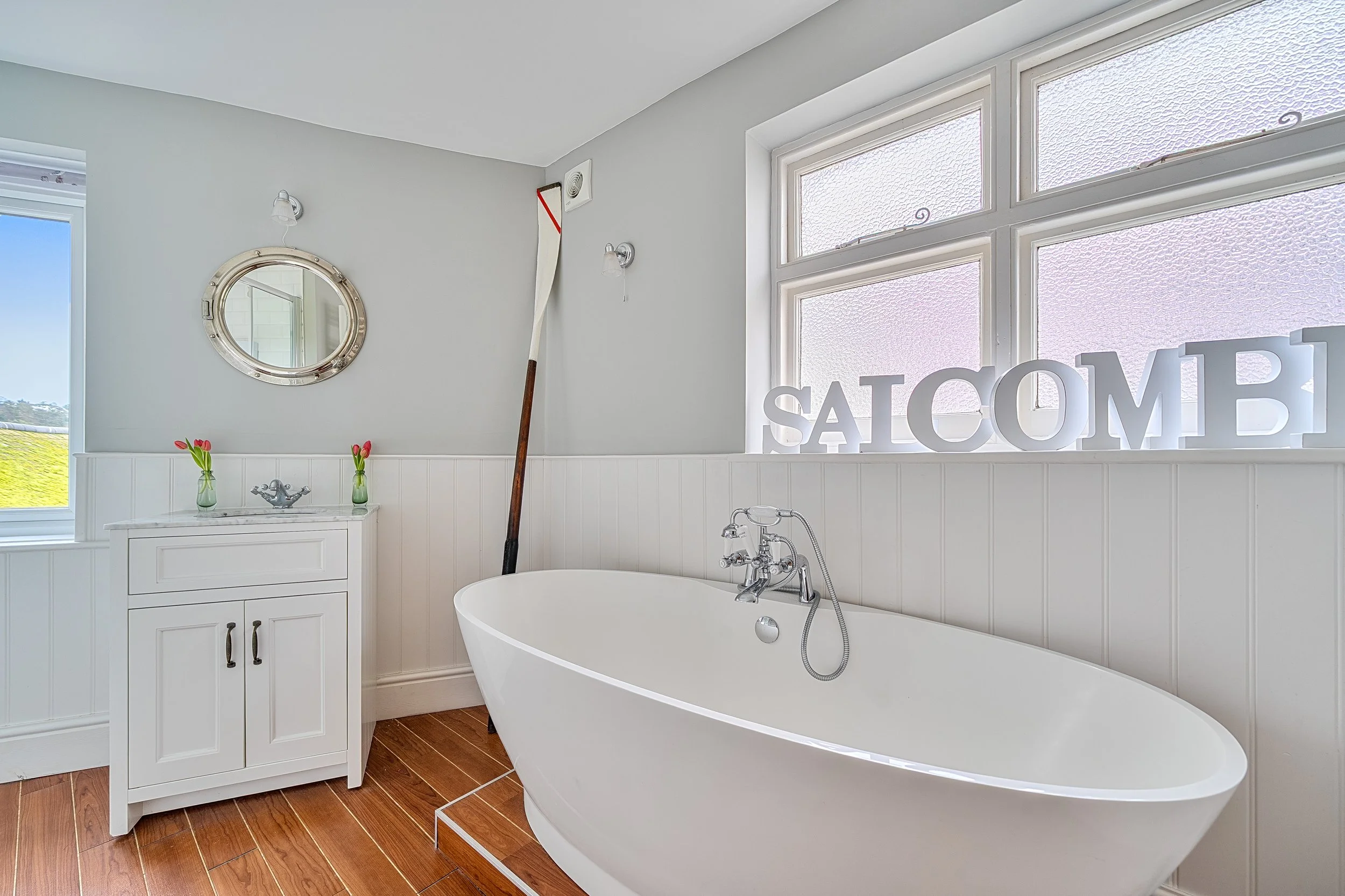 The master bedroom has crisp clean lines provided by the gorgeous white wooden furniture and linen. French windows open out onto your private balcony overlooking the clear blue waters of the Salcombe estuary provided by the ria (a drowned river valley) that stretches from the English Channel to the nearby town of Kingsbridge. The en suite provides a loo, shower, and hand basin, whilst the family bathroom offers a luxurious Chalice Major slipper bathtub, an architectural centrepiece for any bathroom. It also has a loo with a view!