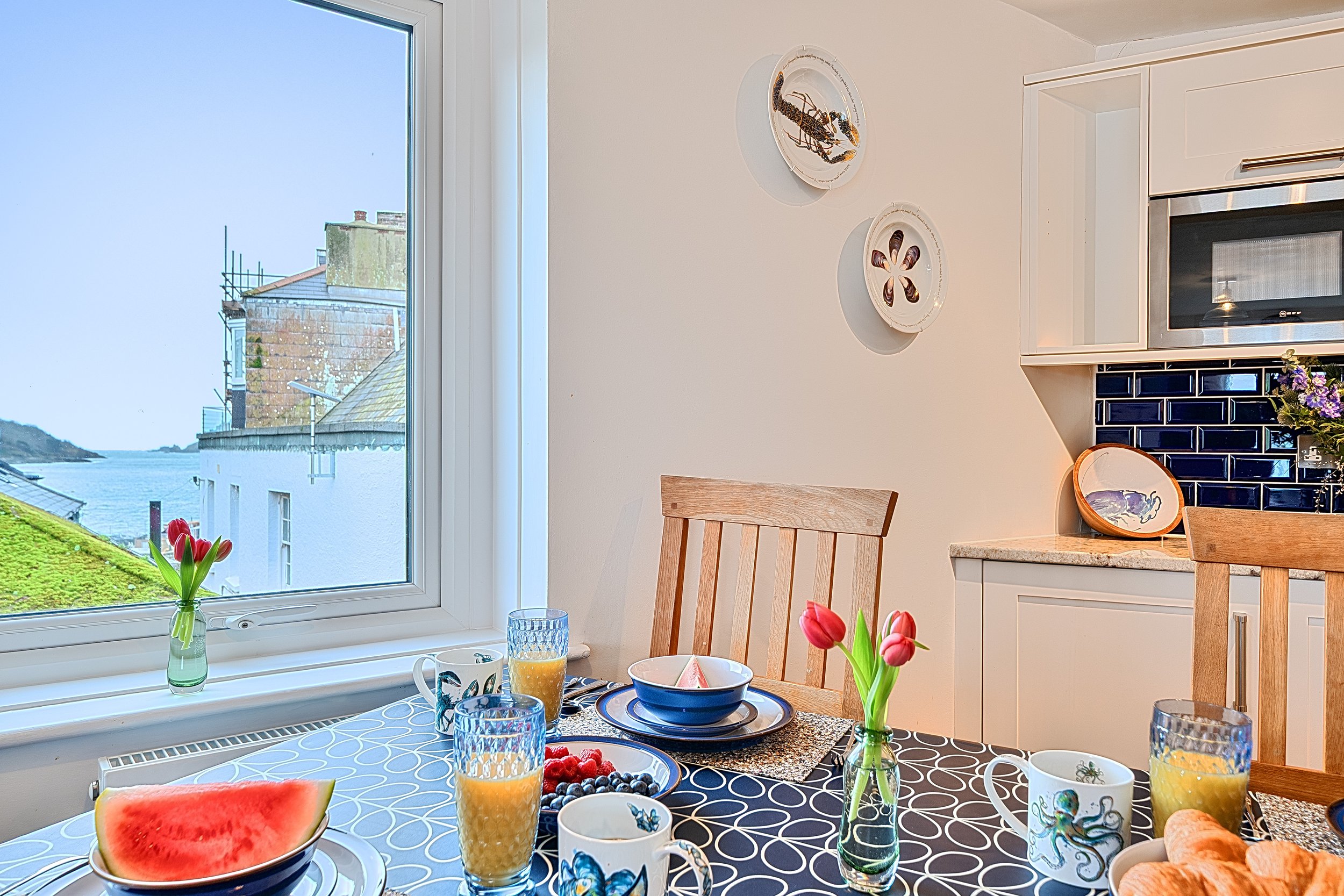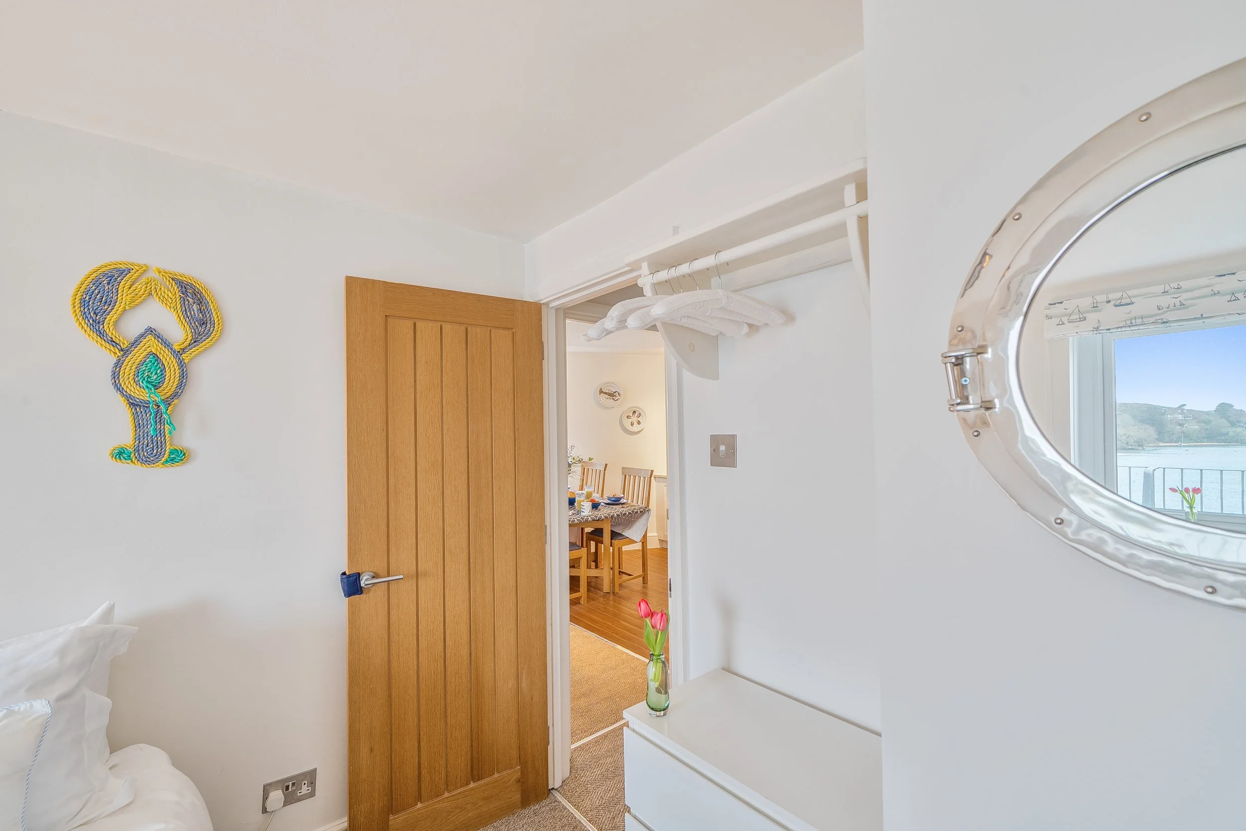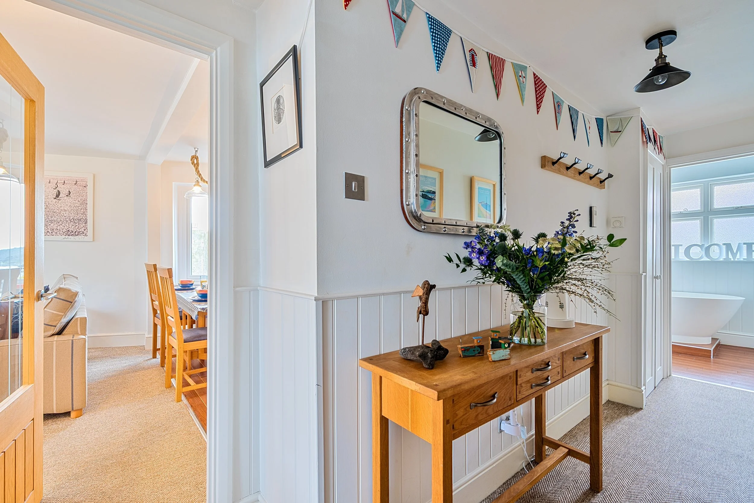 The kitchen has some striking navy tiles creating a classic and smart splashback in the kitchen zone with its largely white décor. You don’t have to worry about appliances – everything you would expect and maybe a little more, is here for you to utilise in the kitchen, whether rustling up an easy breakfast or something more substantial – although with the town at your fingertips and a plethora of eating establishments, why waste time cooking when someone else is only too happy to take care of your needs in Salcombe.